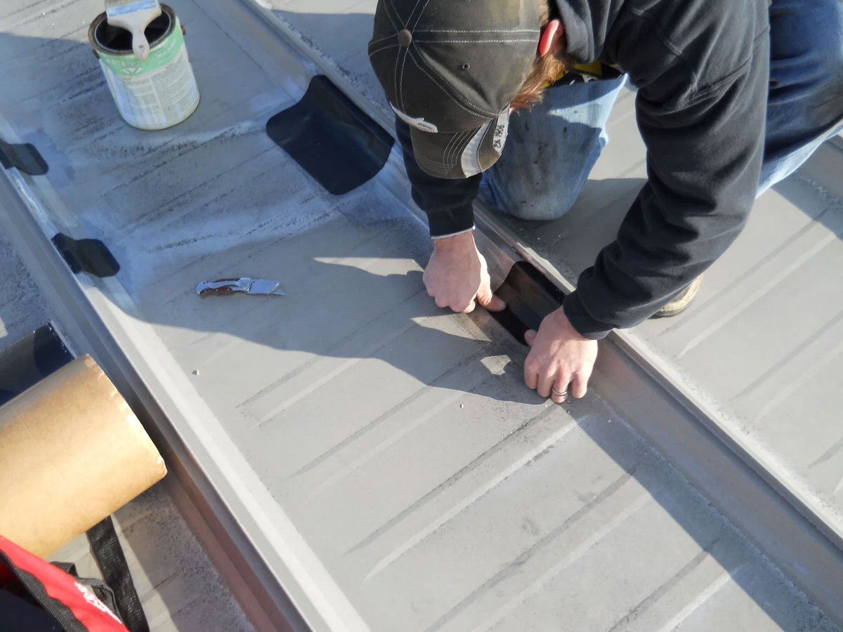 Монтаж новой крыши. Обработка герметиком или битумной мастикой для гидроизоляции.